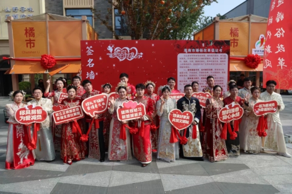 “良緣由夙締,佳偶自天成?!眱x式現場(chǎng),市民政局主要負責人作為證婚人,向新人們致以誠摯祝愿;市婦聯(lián)主要負責人擔任主婚人,寄語(yǔ)新人執手相伴、共筑家國。新人遵循傳統禮儀行三拜之禮,鄭重簽下婚書(shū),共飲合巹酒,每一個(gè)環(huán)節都飽含對婚姻的敬畏與對美好生活的期許。新人代表宣讀《抵制高額彩禮倡導文明新風(fēng)倡議書(shū)》,以青春之名號召全社會(huì )踐行婚事新辦、簡(jiǎn)辦,樹(shù)立文明新風(fēng)。隨后,新人們拋灑喜果、分享甜蜜,并在“文明婚俗”簽名墻上留下莊重承諾。