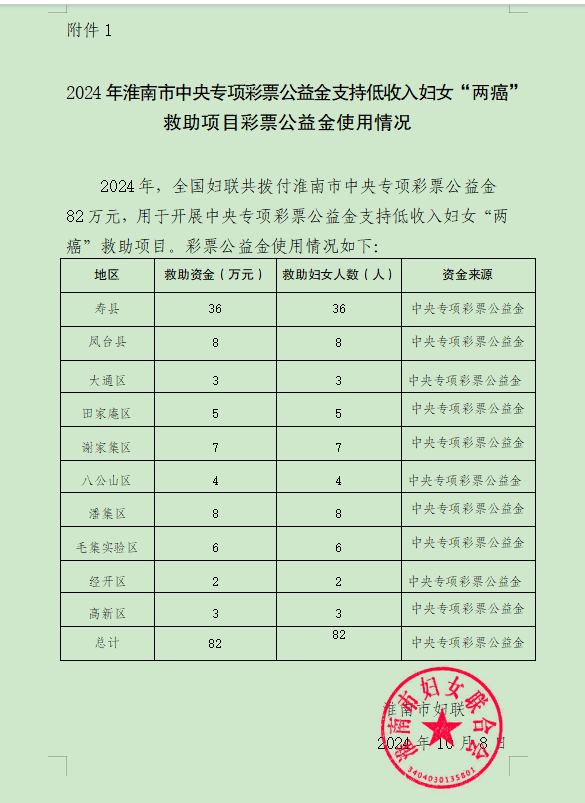 附件1:2024年淮南市中央專(zhuān)項彩票公益金支持低收入婦女“兩癌”救助項目彩票公益金使用情況